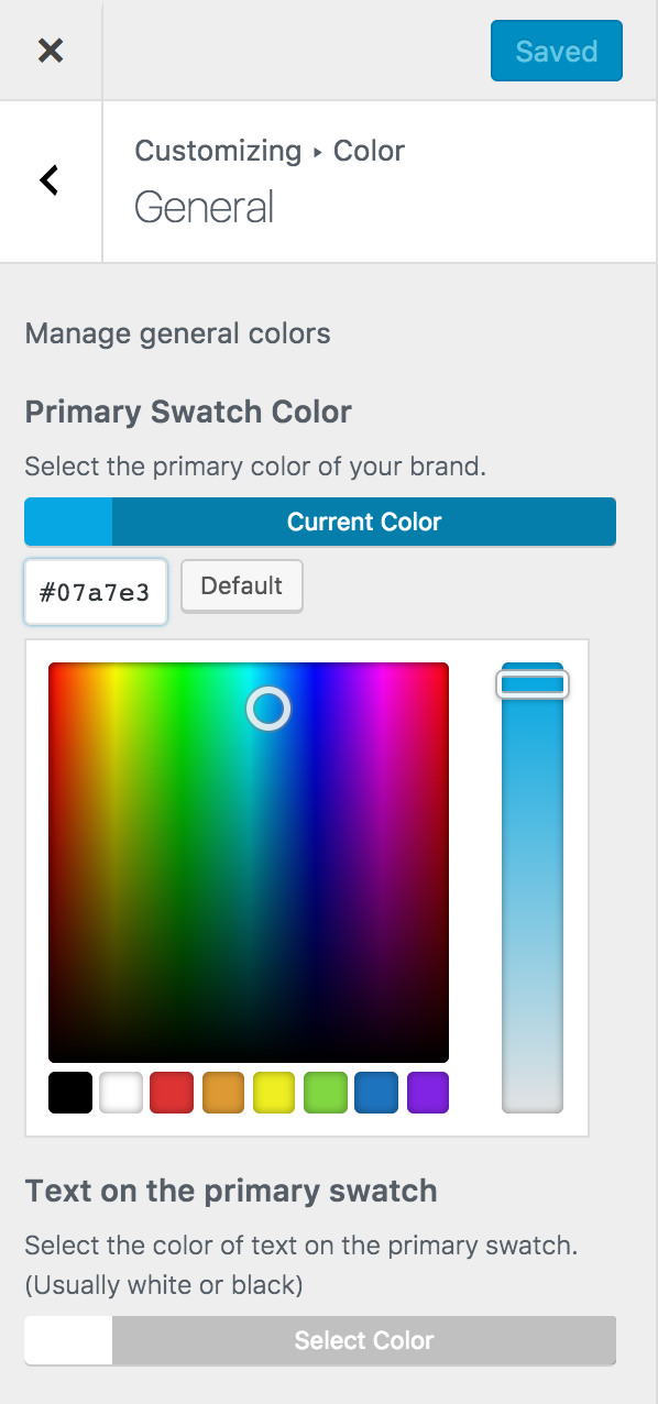 The Text on the primary swatch is the color of text that appears on your primary color. So if you're using a light hue you may wish to change this to a dark color to make it visible.
