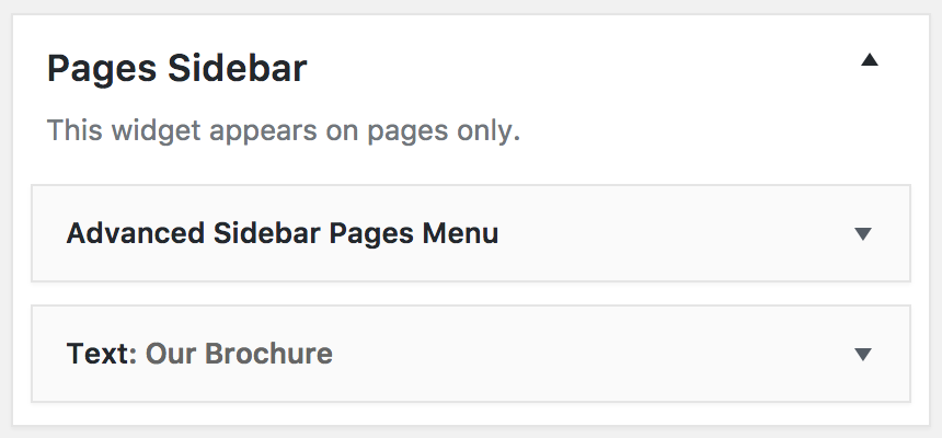 The Pages sidebar widget area is made up of two widgets. The Advanced Sidebar Pages Menu - this is a plugin you will have added in the install step. And a text widget which is the feature underneath.